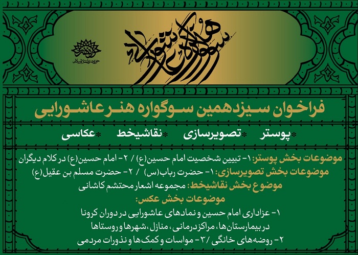 حوزه هنری انقلاب اسلامی برای عرض ارادت هنرمندان به ساحت مقدس امام حسین علیه السلام و شهدای گرانقدر کربلا سیزدهمین سوگواره هنر عاشورایی را برگزار می کند.