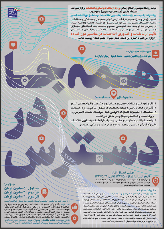 رئیس مرکز روابط عمومی و اطلاع رسانی وزارت ارتباطات و فناوری اطلاعات، در ادامه از همه عکاسان علاقمند دعوت کرد که با حضور در مناطق محروم و دورافتاده لحظات ناب و تکثیر ارتباطات و فناوری اطلاعات را ثبت و به دبیرخانه مسابقه ارسال کنند.