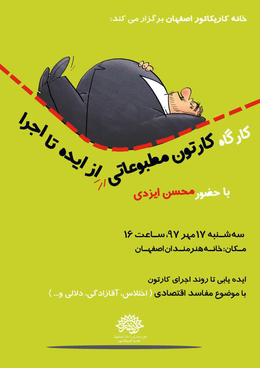 این کارگاه در ساعت 16 روز سهشنبه ۱۷ مهر ۹۷ در خانه هنرمندان اصفهان با حضور علاقه مندان و کاریکاتوریست ها و کارتونیست های اصفهان برگزار می شود.