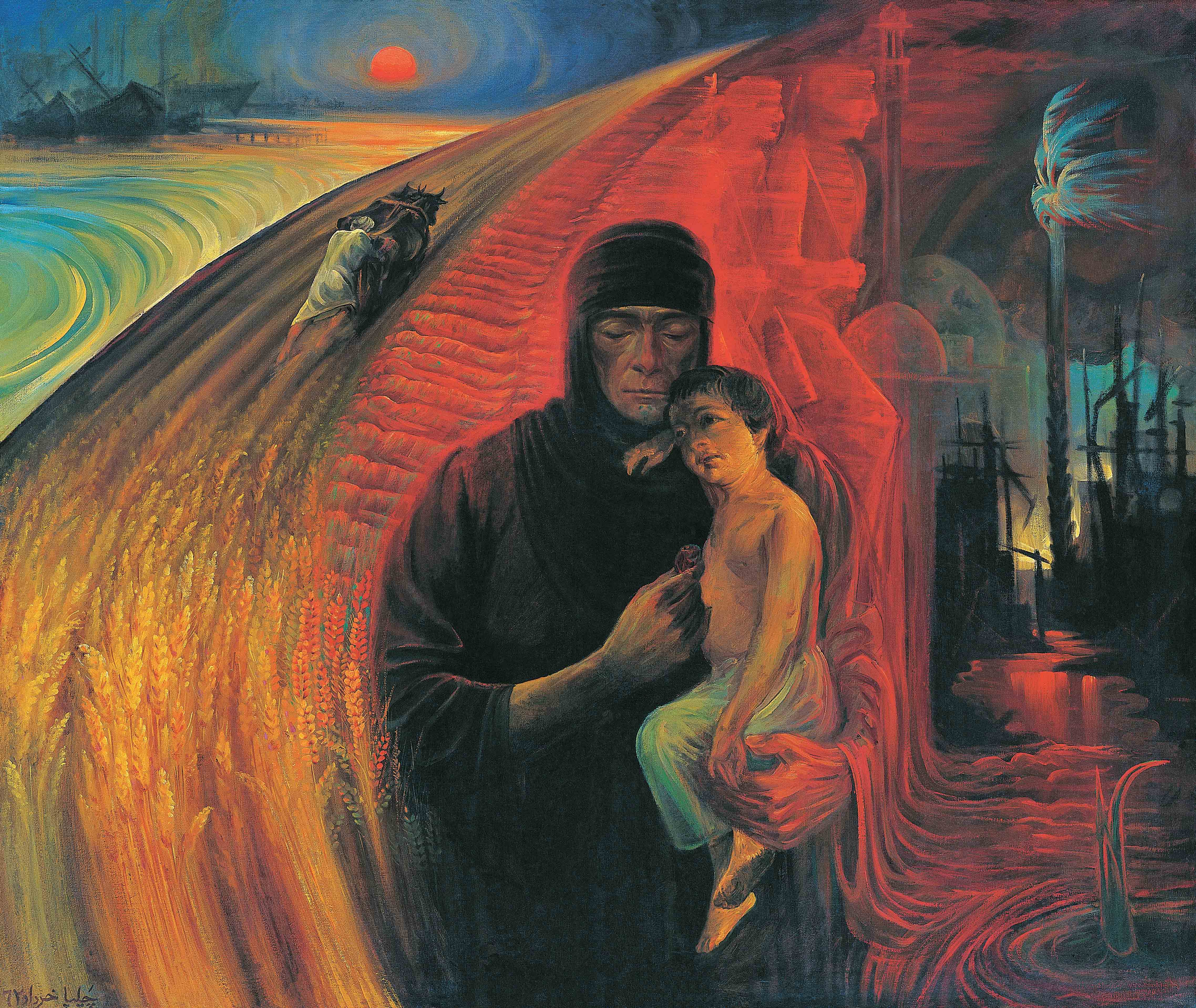 در مرکز تابلو، تصویر مادری دیده می شود که کودکش را در آغوش گرفته، دست چپ مادر غرق در خونِ همسر یا فرزندی است که برای دفاع از کشور به جبهه اعزام شده است. نیمرخ چهره ی مردان رزمنده رو به سوی نخلستانی است که طوفانی سهمگین آن را درنوردیده و پُر است از نخل های شکسته. این طوفان همان تجاوز نیروهای دشمن است. خون شهیدان در سمتِ راستِ تصویر از کنار دستِ مادر و زیر پاهای سربازان امتداد یافته و نخلستان را آبیاری می کند، در این مکان گل لاله ای روییده است. در سمتِ چپِ تابلو کشتزاری دیده می شود با گندم های طلایی و زیبا و مردی که با گاوآهن در حال حرکت است، این حرکت می تواند نمادی از زندگی و رویش و آبادانی در کشور باشد. در قسمت بالای اثر،سمتِ چپ دریایی می بینیم و کشتی هایی نیمه واژگون و خورشیدی که در حالِ غروب است...اما خون شهیدان ریشه های درخت انقلاب را آبیاری خواهد کرد و جوانه های تازه ای سر از خاک سرخ سر بر خواهند آورد.