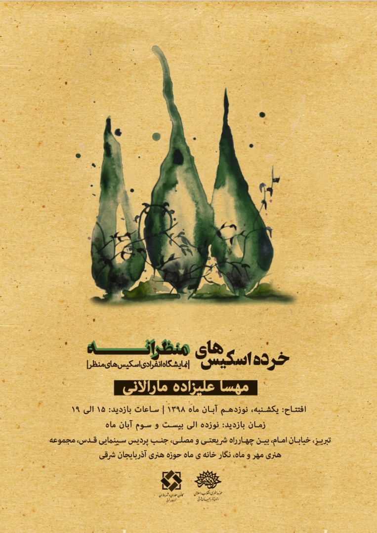 نمایشگاه خرده اسکیس های منظرانه با 30 اثر از مهسا علیزاده مارالانی از 19 تا 23 آبان ماه امسال از ساعت 15 تا 19 در گالری ماه حوزه هنری استان واقع در چهارراه شریعتی، جنب پردیس فرهنگی سینمایی قدس تبریز برای بازدید عموم دایر است.