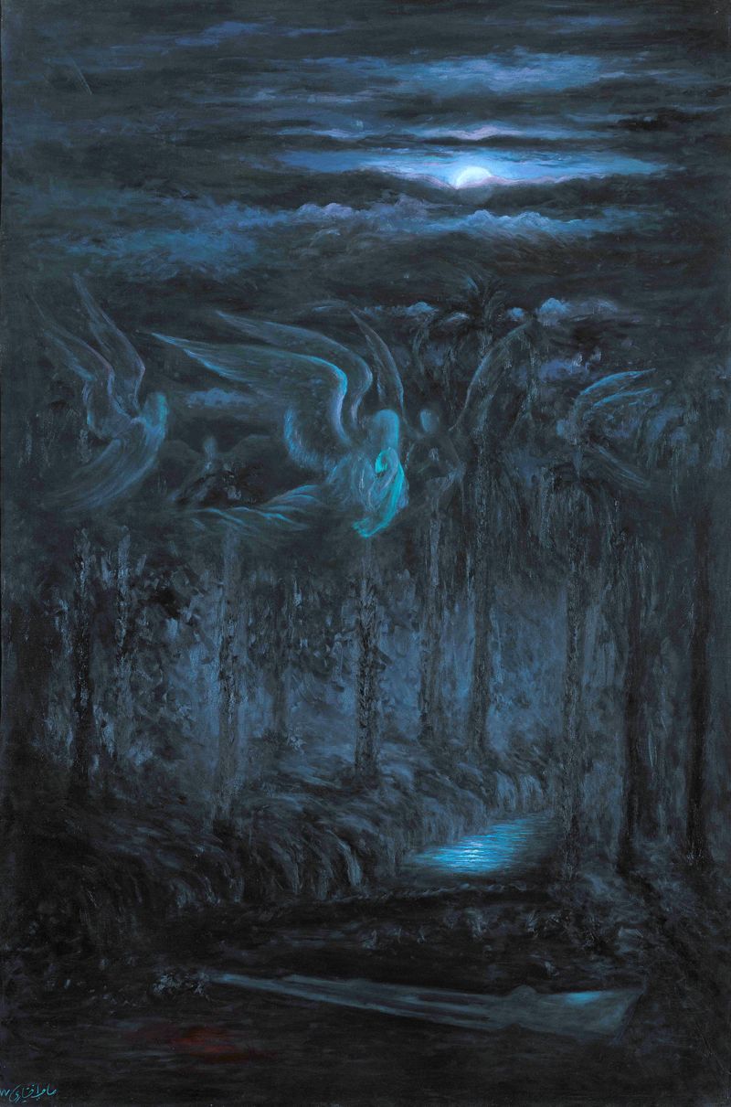 رویایی در جریان است . در لحظه ای زمان متوقف می شود و همه چیز رنگ و بوی متفاوت می گیرد . نوری تمام تابلو را فرا گرفته که از خورشیدی روشن تر بالای تابلو سرمنشاء میگیرد . اما نمی دانیم  واقعا روز است ؟! همین بازی هوش مندانه نقاش با رنگها ما را در ابهام فرو می برد که گویی زمان خاصیت این جهانی ندارد .